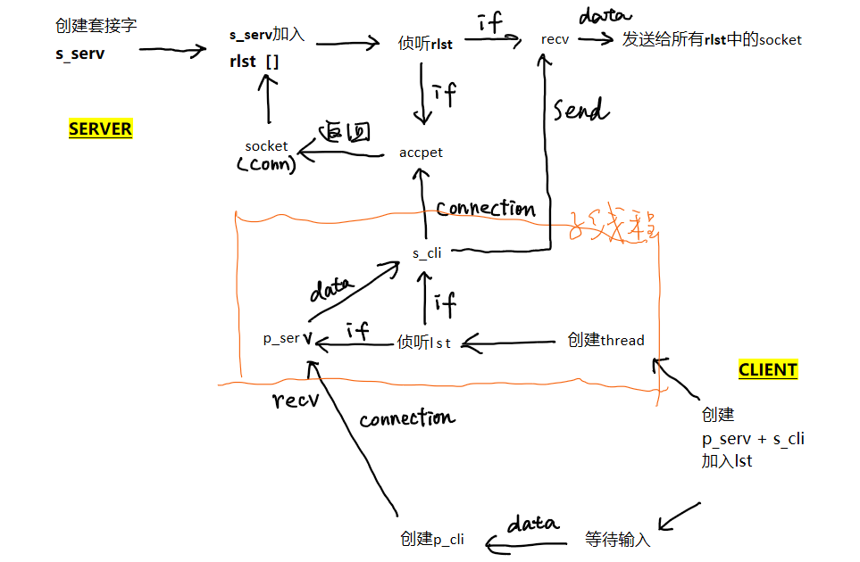- 主线程收到用户输入后,创建p_cli,用p_cli带着用户输入的数据连接p_serv ,p_serv收到p_cli 的连接,变成可读状态,被select装进列表返回;
